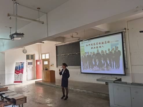 随后,襄阳民发瑞际酒店人力资源部总监焦丽与同学们就“如何成为优秀的酒店职业经理人”进行交流。焦丽总监不仅介绍了襄阳目前最奢华的酒店——民发瑞际酒店的情况,更是讲解了高星级酒店对员工的行为素质要求,告诉同学们在工作中要有服从意识、敢于挑战、积极进取等良好品德。
