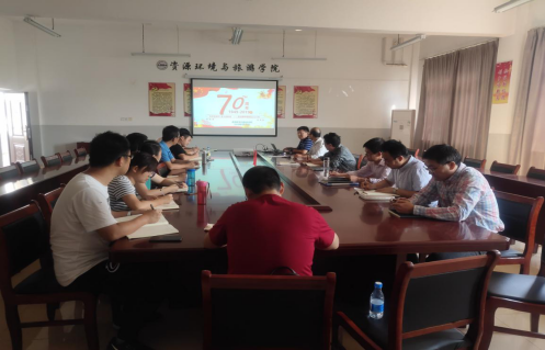 (通讯员邓洁屹)“五星红旗迎风飘扬,胜利歌声多么响亮,歌唱我们美丽的祖国,从今走向繁荣富强……”资环学院党员教师用歌声致敬祖国、讴歌时代,诉说着对伟大祖国的热忱与依恋,抒发着身处伟大时代的骄傲与自豪。党委副书记鲁宏图带领大家学习了《关于在“不忘初心、牢记使命”主题教育中加强爱国主义教育、弘扬爱国主义精神的通知》文件精神。党委书记杨霄分别从“十一国庆节历史由来、七十年光辉历程.伟大成就、中国进入社会主义新时代、追梦新时代 奋斗新征程”四个部分带领大家了解了中国七十周年以来的发展历程。