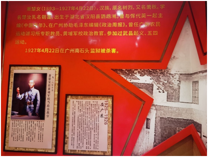 进门这尊铜像,就是萧楚女,萧楚女原名萧秋,楚女是他的笔名。他以“楚女”为笔名,宣传马列主义和救国救民真理。曾有人误会萧楚女是位楚楚动人的女性,其实他身材魁梧、皮肤黝黑。对此萧楚女曾有解释:“屈原离骚中‘忽反顾以流涕兮,哀高丘之无女’的女是意志坚定,能够力挽狂澜的神女,我希望自己能做一个拯救民族危亡的‘楚女’”。可以看出,他是一位有理想有抱负的人。萧楚女的人生格言是“人生应该如蜡烛一样,从顶燃到底一直都是光明的”他的主要精神就是蜡烛精神和自我牺牲精神,这也是他光辉的一生真实写照。伟大领袖毛泽东用唐朝大诗人李商隐的诗句:“春蚕到死丝方尽,蜡炬成灰泪始干”来赞扬萧楚女的红烛精神。