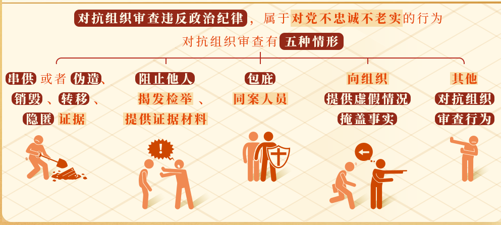 《中国共产党纪律处分条例》第六十三条规定了对抗组织审查,应予处分的五种情形:串供或者伪造、销毁、转移、隐匿证据;阻止他人揭发检举、提供证据材料;包庇同案人员;向组织提供虚假情况,掩盖事实;其他对抗组织审查行为。
