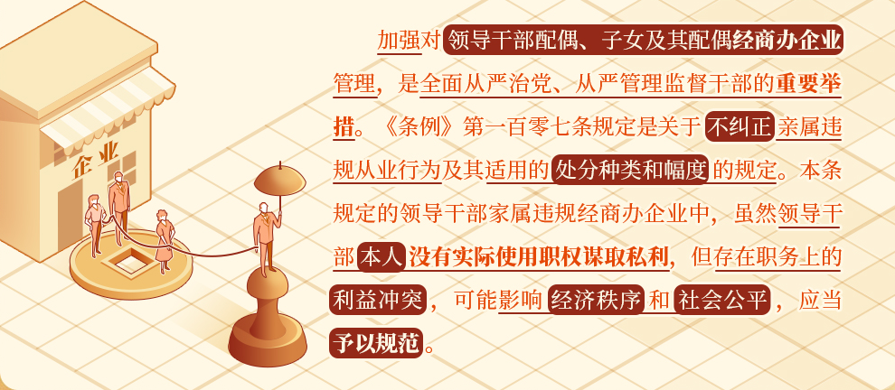 《条例》规定的“违反经商办企业禁业规定”,主要衔接的是2022年中央办公厅印发的《领导干部配偶、子女及其配偶经商办企业管理规定》。《规定》明确,领导干部配偶、子女及其配偶经商办企业管理的适用对象,主要是党政机关、群团组织、企事业单位厅局级及相当职务层次以上领导干部;经商办企业情形,主要是投资开办企业、担任私营企业或外资企业等高级职务、私募股权基金投资及从业、从事有偿社会中介和法律服务等行为。《规定》对不同层级、不同类别领导干部配偶、子女及其配偶经商办企业分别提出了禁业要求,领导干部职务层次越高要求越严,综合部门严于其他部门。实践中,各地区各单位根据本地区本单位实际,细化完善了领导干部配偶、子女及其配偶经商办企业禁业范围。领导干部要按照党中央及本地区本单位的相关规定,加强对家属的教育和约束,做廉洁治家的模范。