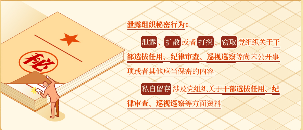 《中国共产党纪律处分条例》第一百四十四条对泄露组织秘密行为作出了处分规定。泄露、扩散或者打探、窃取党组织关于干部选拔任用、纪律审查、巡视巡察等尚未公开事项或者其他应当保密的内容的,给予警告或者严重警告处分;情节较重的,给予撤销党内职务或者留党察看处分;情节严重的,给予开除党籍处分。私自留存涉及党组织关于干部选拔任用、纪律审查、巡视巡察等方面资料,情节较重的,给予警告或者严重警告处分;情节严重的,给予撤销党内职务处分。