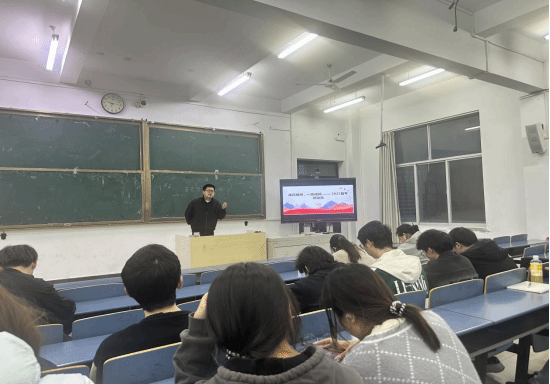 动员会伊始,邓仕元结合学院近几年考研数据,从报考人数、上线率等方面分析我院考研整体情况,呈现历年考研趋势与成果,帮助同学们把握现状、定位目标。随后,他围绕考研核心要点详细讲解。在注意事项上,解读院校与专业选择、报考流程等内容,提醒避开误区、理性规划。在时间安排上,结合关键节点制定全周期备考计划,明确各阶段任务与节点,助力高效复习。在研究生福利方面,介绍奖助体系、科研平台等内容,激发备考动力。讲解中,邓仕元结合自身经验与案例,语言生动、内容翔实,同学们认真聆听、积极记录,现场学习氛围浓厚。