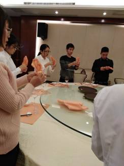 本次实训持续两天,共分为三个实训内容:第一天同学们主要学习了中餐摆台、餐巾折花、宴会服务,并且实际体验了一次婚宴服务的全过程;第二天上午进行酒店服务礼仪观摩学习,感受民发世际大酒店的金钥匙许经理的精彩展示;第二天下午进行客房中式铺床的学习与操练。
