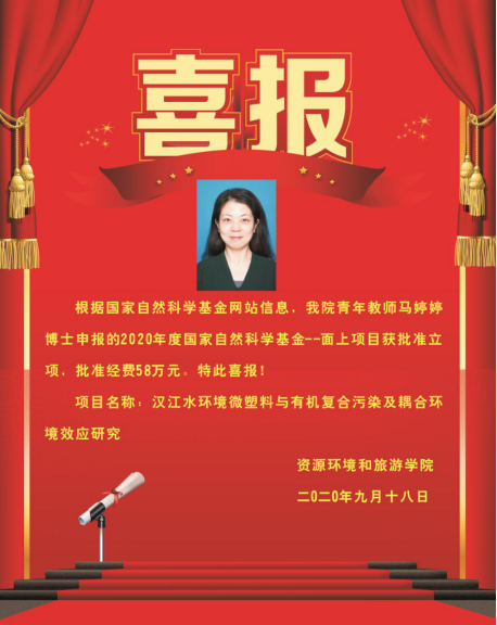 9月18日,根据国家自然科学基金网站信息,我院青年教师马婷婷博士申报的2020年度国家自然科学基金项目(项目名称:汉江水环境微塑料与有机复合污染及耦合环境效应研究)获批准立项,批准经费58万元。特此恭贺!