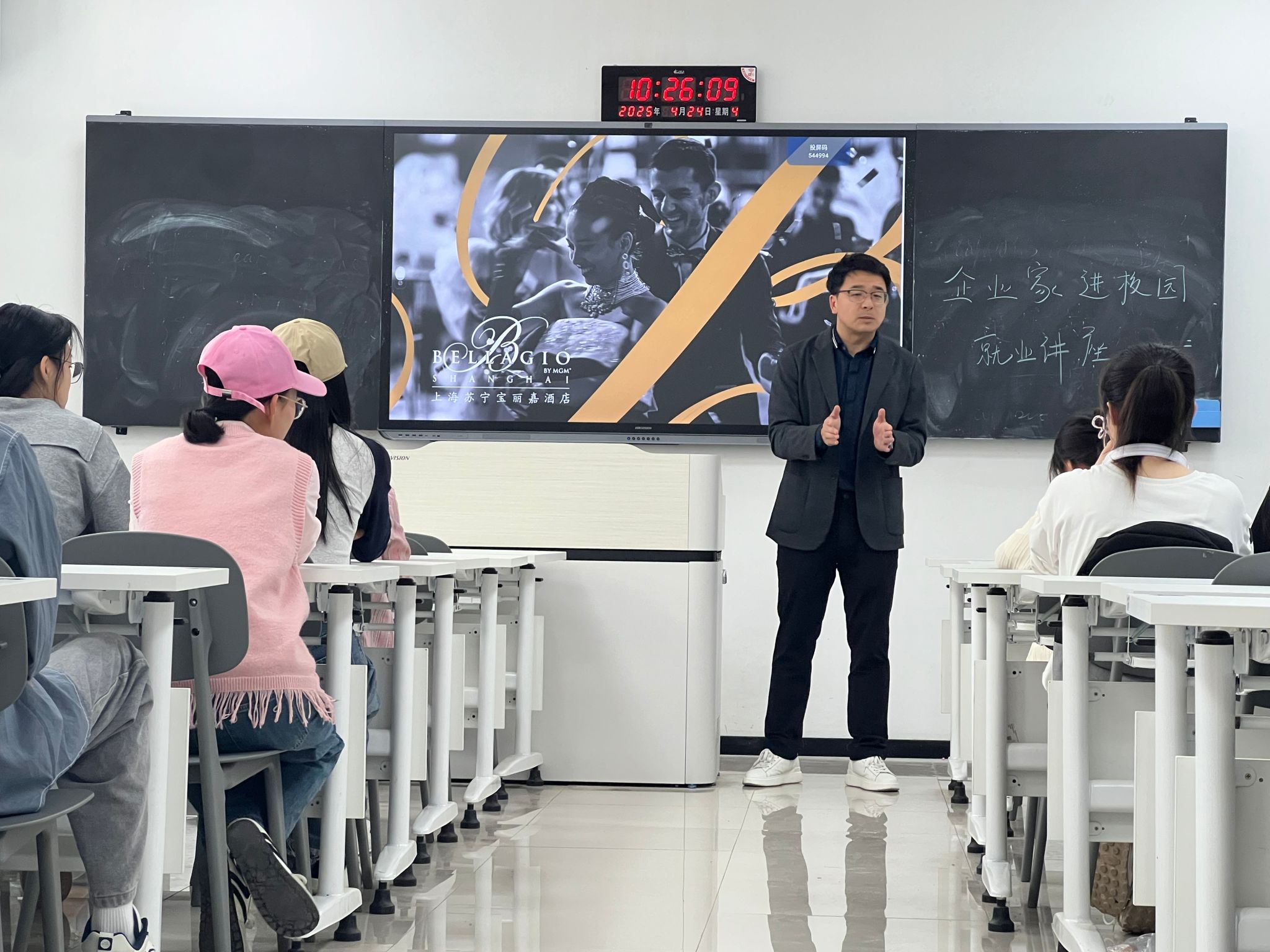 (通讯员 薛巧玲 徐志雄)为帮助旅游管理专业学生深入了解行业动态、明晰实习方向、科学规划职业发展路径,资环学院旅游管理系于4月24日10:20和14:00分别在东津505与N4-102教室举办“企业家进校园”实习就业系列讲座。此次活动特邀上海舟济咨询管理有限公司总经理陈龙担任主讲人,由系主任王天天主持,旅游管理专业26届全体毕业生共同参与。