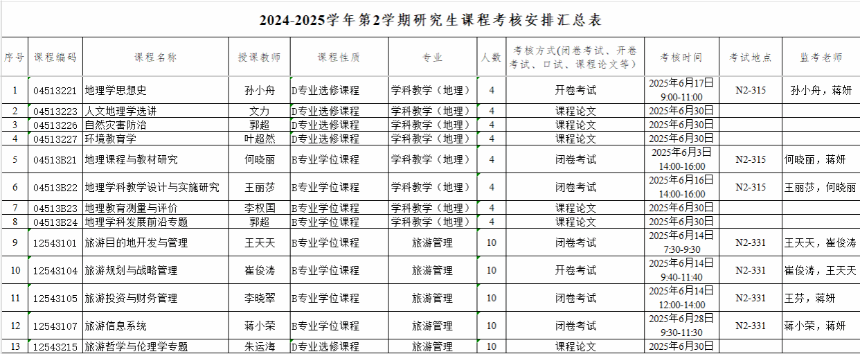 2024-2025学年第2学期研究生课程考核安排汇总表