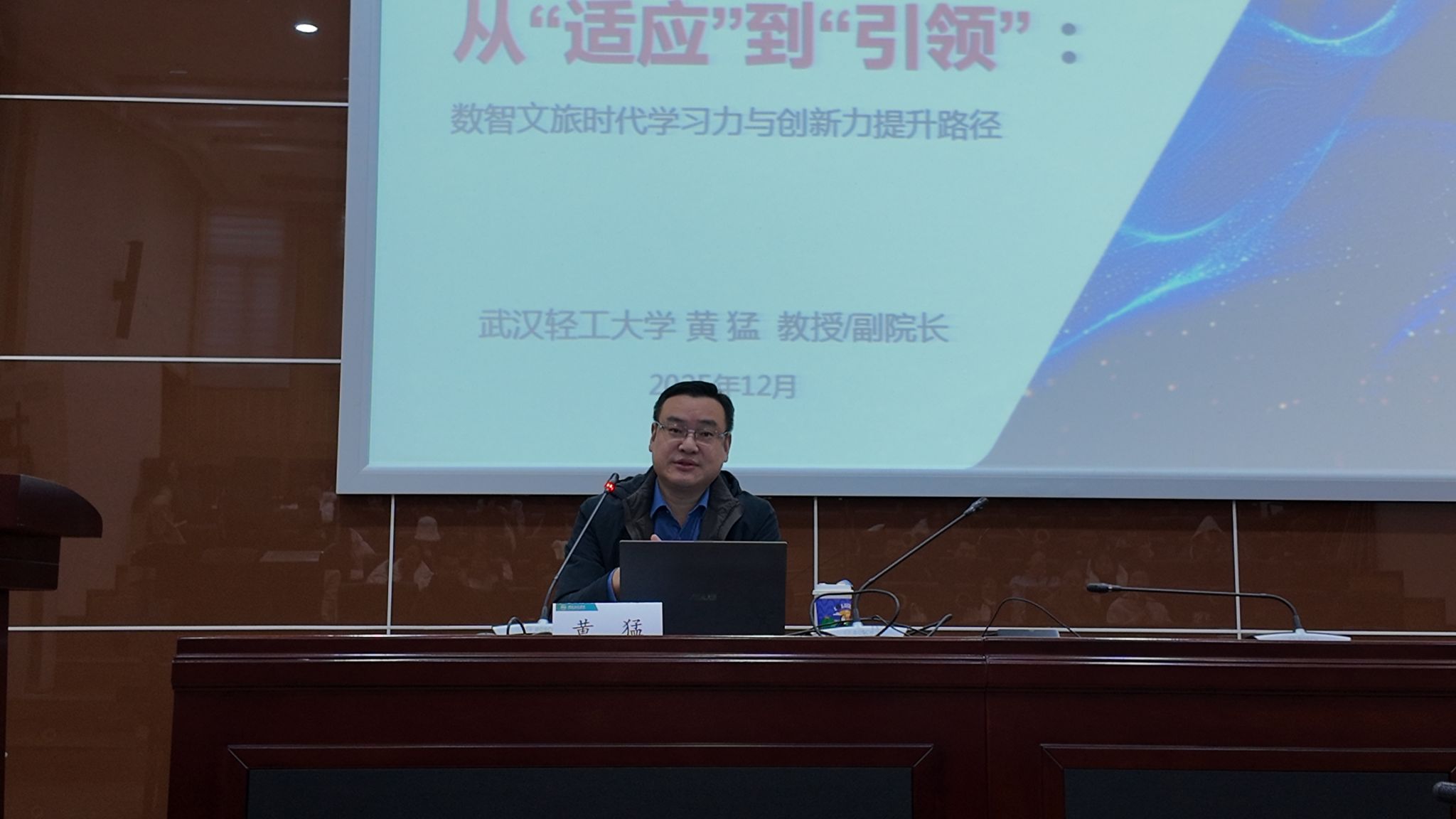 (通讯员:李萍)2025年12月5日上午,威廉williamhill旅游管理硕士(MTA)教育中心“文旅问道讲堂”学术报告会在图书馆一楼报告厅顺利举行。本次报告会特邀武汉轻工大学黄猛教授与武汉商学院旅游管理学院副教授、湖北省旅游学会秘书长刘军博士担任主讲嘉宾,围绕数智文旅时代的能力提升与湖北旅游产业空间发展两大主题展开深入分享。本次讲座由旅游管理硕士(MTA)教育中心主任朱运海教授主持,WilliamHill威廉希尔师生及相关领域学者参与了本次活动。